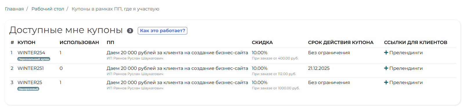 В рамках ПП у Организатора есть возможность создать прелендинги (небольшой ленд с 1 секцией) и давать своим партнерам купоны.