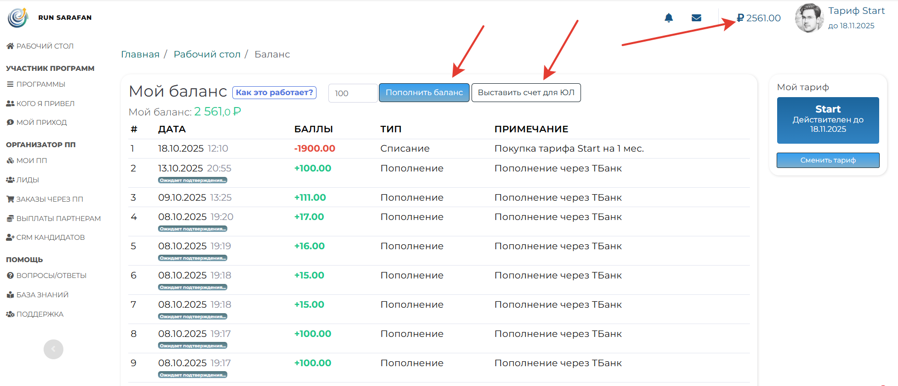 Пополнение баланса для продления платных тарифов