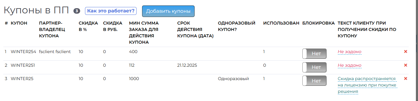 2. Партнер в своем ЛК видит все доступные ему купоны на странице Купоны (/coupons).