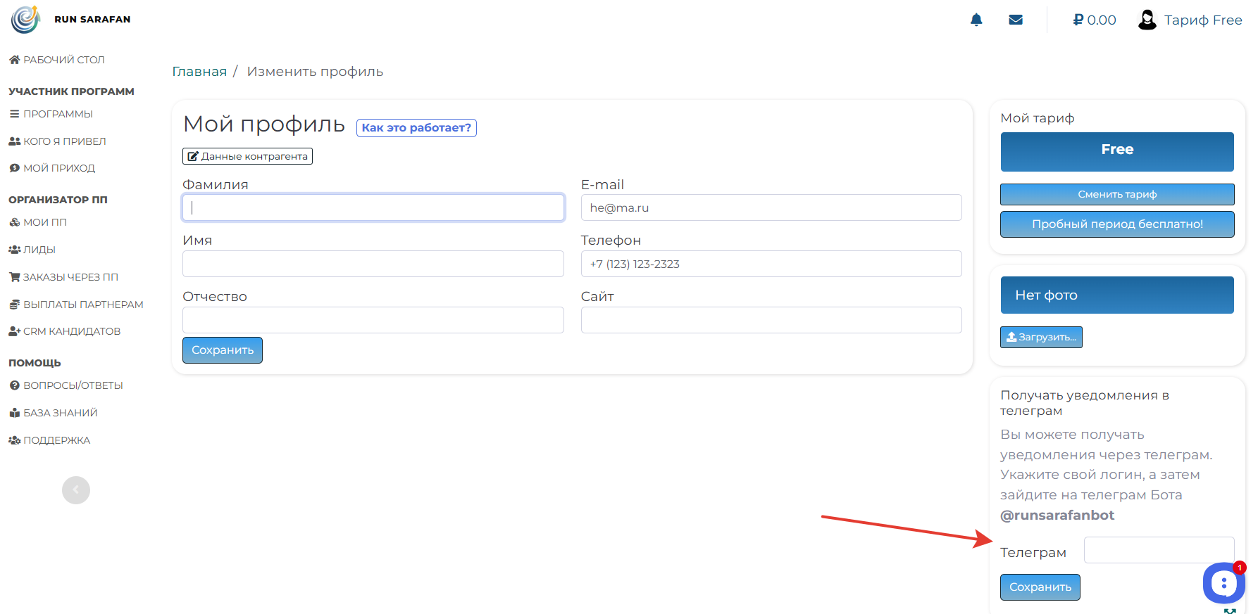 На странице Мой профиль вы можете заполнить данные о себе, указать контакты, фото, а также заполнить данные контрагента (с автозаполнением).